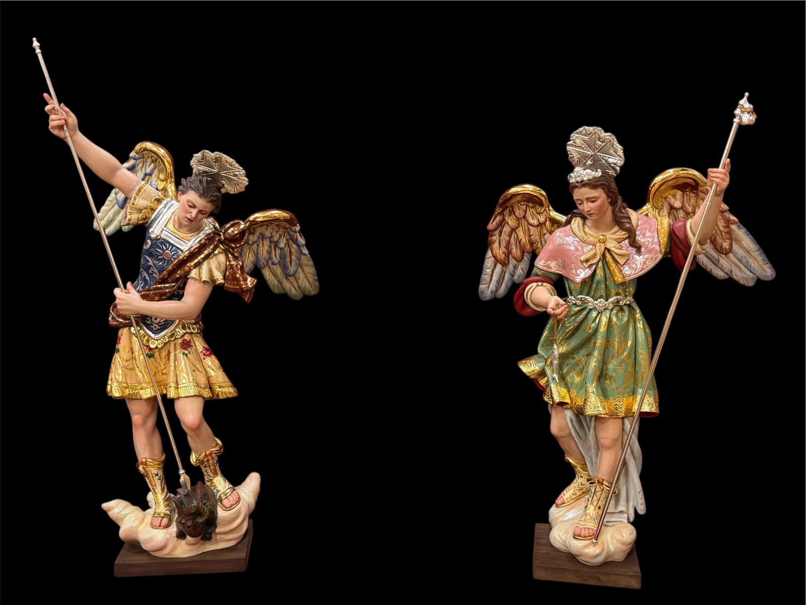 80 cm de altura tallados en madera de cedro real con policromías al óleo en las carnes y estofados de temple al huevo en las telas.