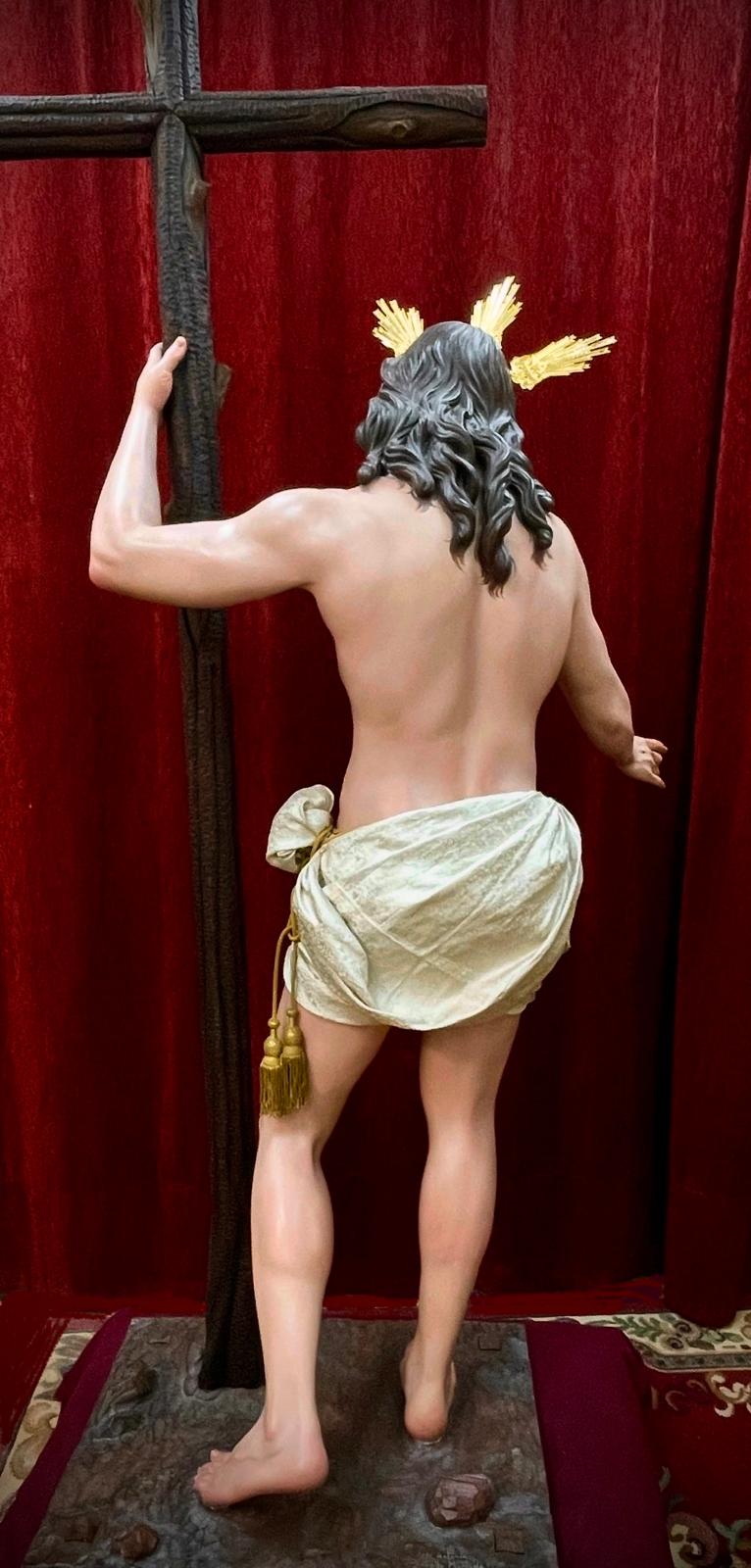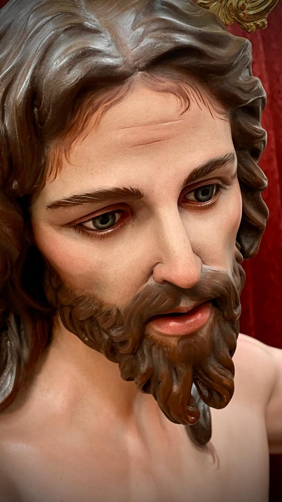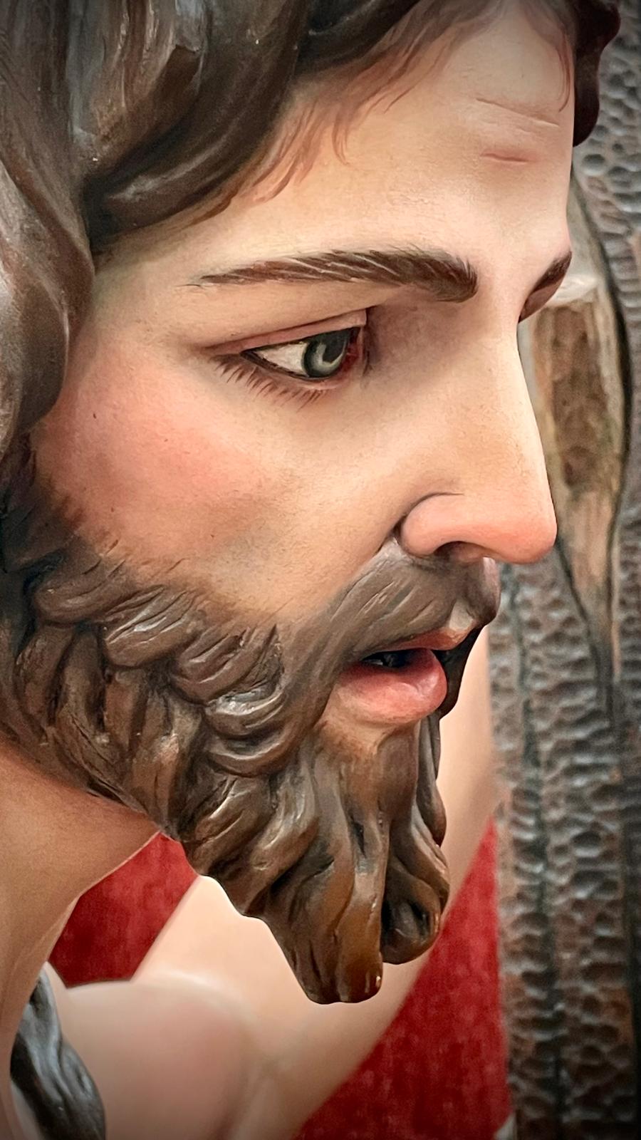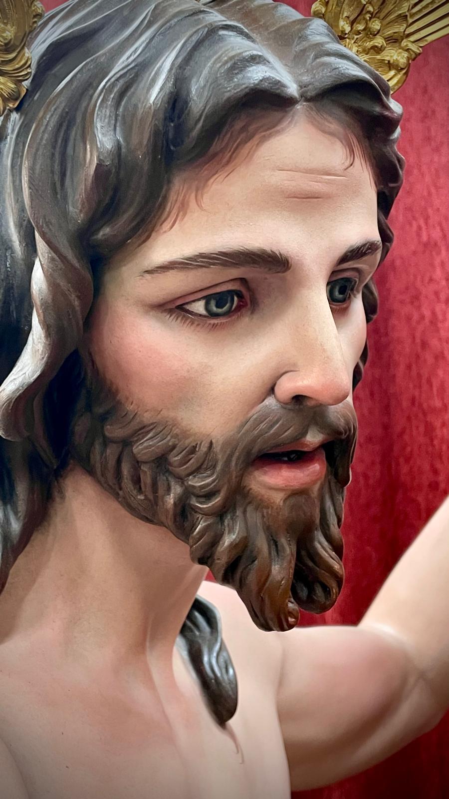 Imagen a tamaño natural tallada en madera de cedro real, acabado de policromías al óleo.