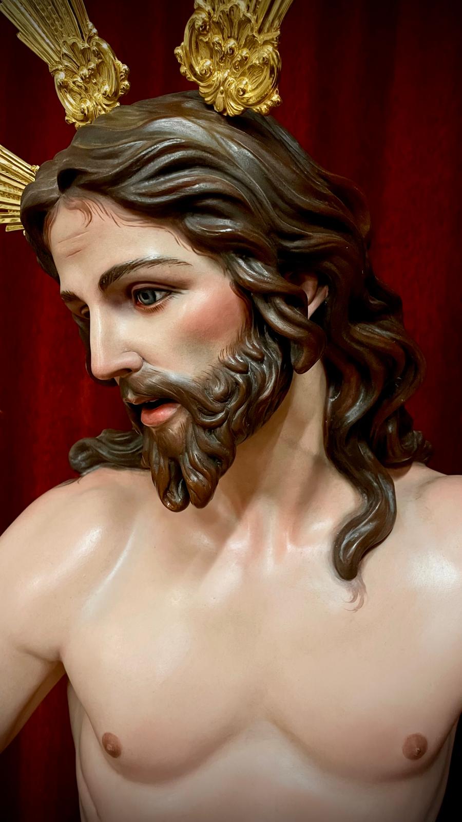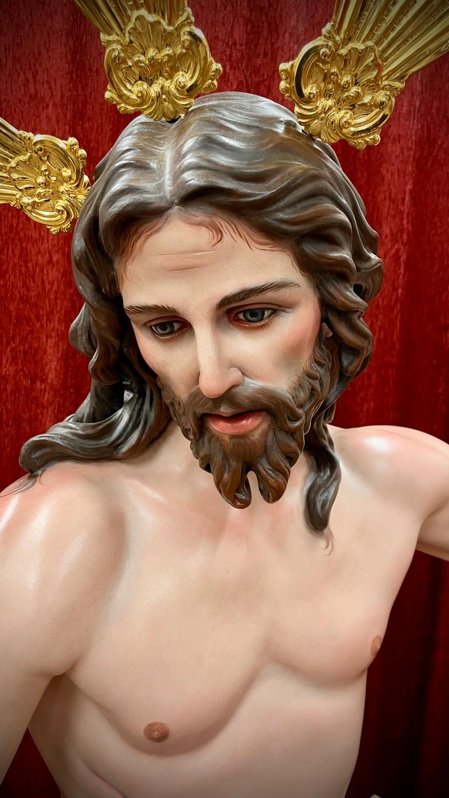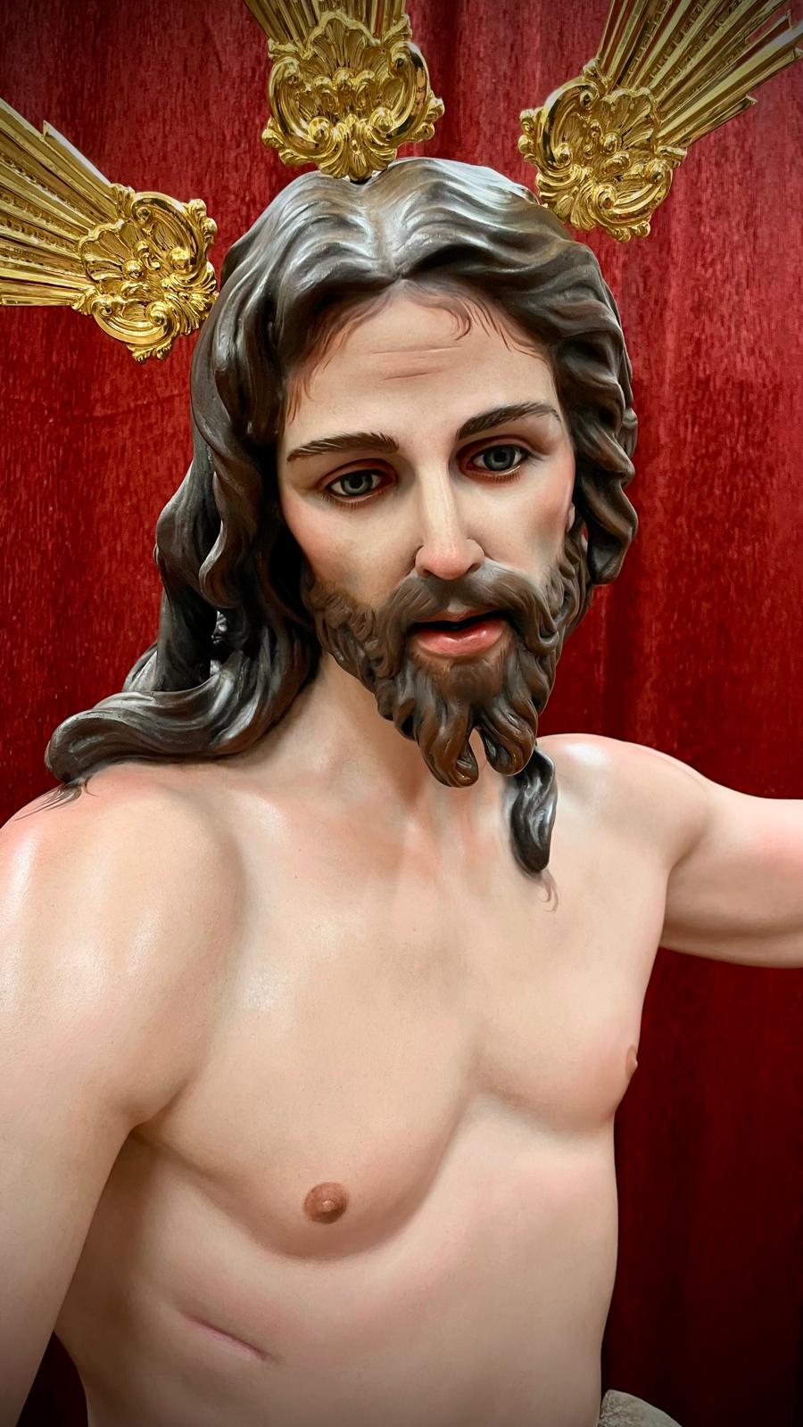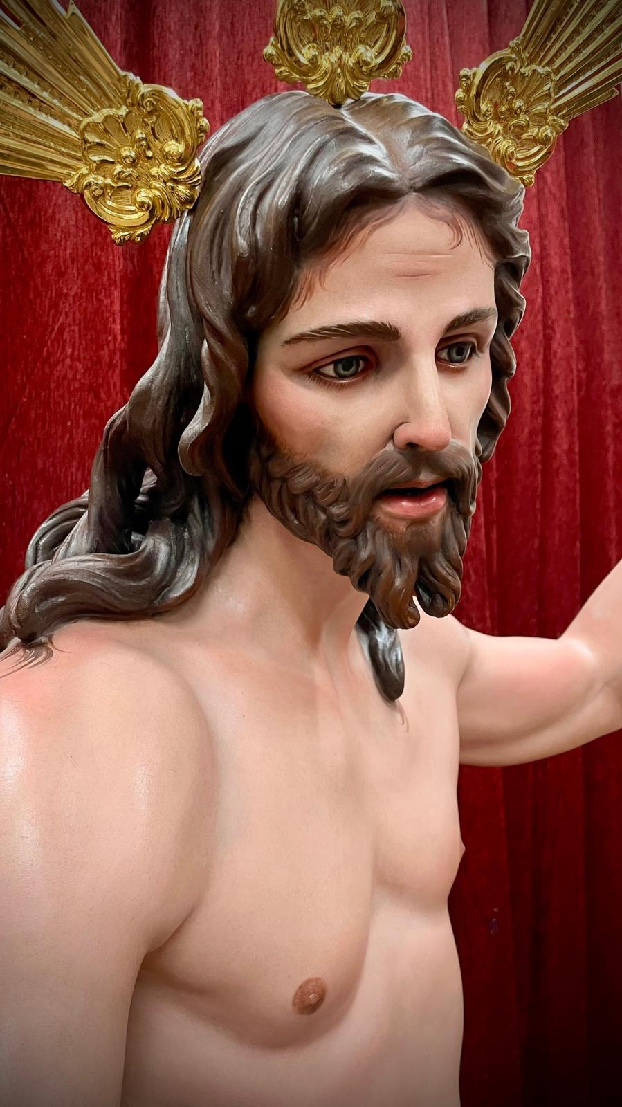 Imagen a tamaño natural tallada en madera de cedro real, acabado de policromías al óleo.